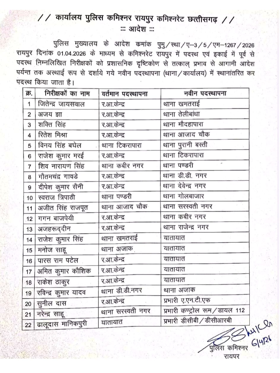 - कमिश्नर के आदेश पर रायपुर पुलिस में बड़ा फेरबदल: 22 निरीक्षकों का तबादला, कई थानों की कमान बदली