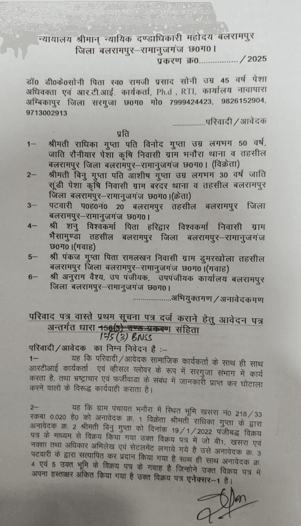 अंबिकापुर।मामला कूट रचित दस्तावेजों के आधार पर ग्राम भनौरा तहसील बलरामपुर में स्थित 143 एकड़ भूमि का विक्रय पत्र टुकड़े-टुकड़े कर अलग-अलग क्रेता विक्रेता के द्वारा निष्पादित करने के संबंध में डॉक्टर डी. के. सोनी अधिवक्ता एवं आईटीआई कार्यकर्ता द्वारा दिनांक 5/2/2025 को धारा 175 भारतीय नागरिक सुरक्षा संहिता 2023 के तहत मय दस्तावेजों के साथ बलरामपुर न्यायिक दंडाधिकारी के न्यायालय में श्रीमती किरण सोनवानी, श्री मनोज कुमार गुप्ता, श्री कृष्ण कुमार सिंह (पटवारी), श्री करण कुमार, श्री आलोक कुमार गुप्ता, संजय कुमार राठौर (उप पंजीयक), बाबूलाल, रामलाल, सुखमनिया, दीप कुमार, मनीष कुमार सिंह (पटवारी), उदय कुमार गुप्ता, विनोद, बालेश्वर राम (उप पंजीयक), रमेश कुमार यादव, जगत यादव, श्रीमती रीमा गुप्ता, श्री नीरज पाल, श्री उदय कुमार गुप्ता, श्री सिद्धार्थ शंकर मिश्रा (उप पंजीयक), कुंजन गुप्ता, चंदन गुप्ता, आशीष कुमार गुप्ता, शांति देवी गुप्ता, श्रीमती पूजा सोनी, श्री राजू पोया (राजस्व निरीक्षक), श्री नागेंद्र प्रसाद सोनी, श्री गौतम गुप्ता, श्री अनुराग वैश्य (उप पंजीयक), श्रीमती राधिका गुप्ता, श्रीमती बिनु गुप्ता, पटवारी, श्री शनू विश्वकर्मा, श्री पंकज गुप्ता के विरुद्ध परिवाद प्रस्तुत किया गया है।