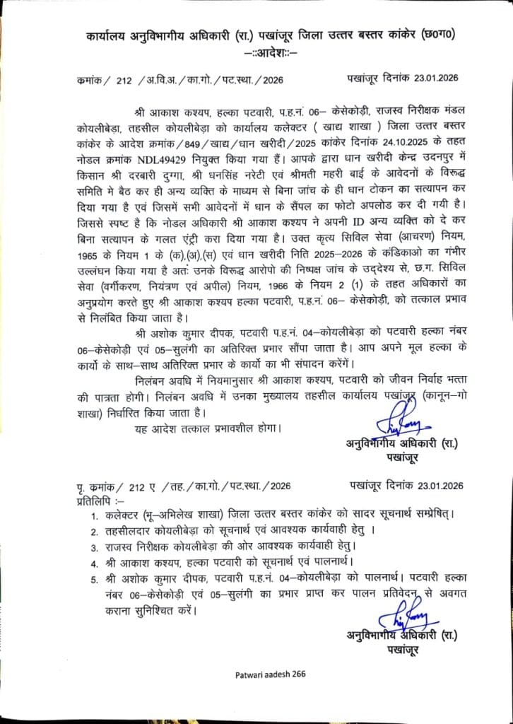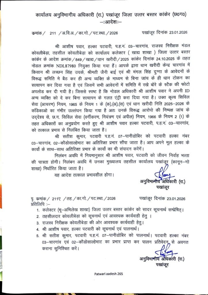 धान खरीदी व्यवस्था में पारदर्शिता और जवाबदेही सुनिश्चित करने के लिए पखांजूर प्रशासन ने कड़ा कदम उठाया है। गंभीर अनियमितताओं और कर्तव्य में लापरवाही के आरोप में पखांजूर एसडीएम ने धान खरीदी केंद्रों में नोडल अधिकारी के रूप में तैनात दो पटवारियों को तत्काल प्रभाव से निलंबित कर दिया है।