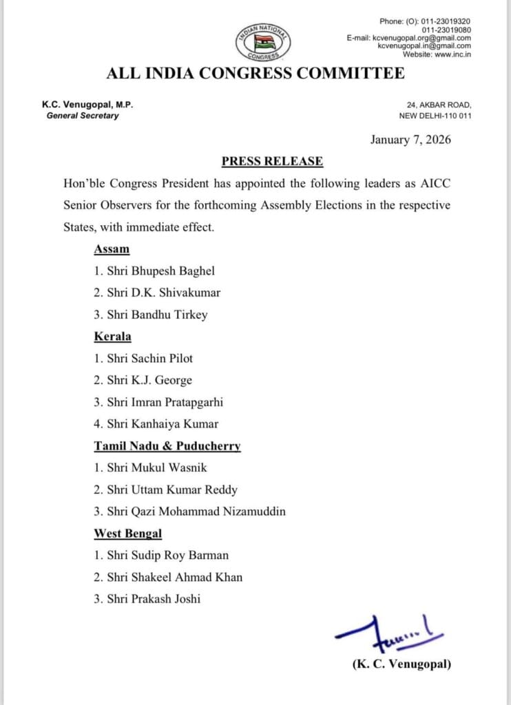 नई दिल्ली। आगामी विधानसभा चुनावों को लेकर कांग्रेस ने संगठनात्मक स्तर पर बड़ा कदम उठाया है। अखिल भारतीय कांग्रेस कमेटी (AICC) ने असम, केरल, तमिलनाडु–पुडुचेरी और पश्चिम बंगाल के लिए सीनियर ऑब्ज़र्वरों की नियुक्ति कर दी है। यह नियुक्तियां तत्काल प्रभाव से लागू होंगी।