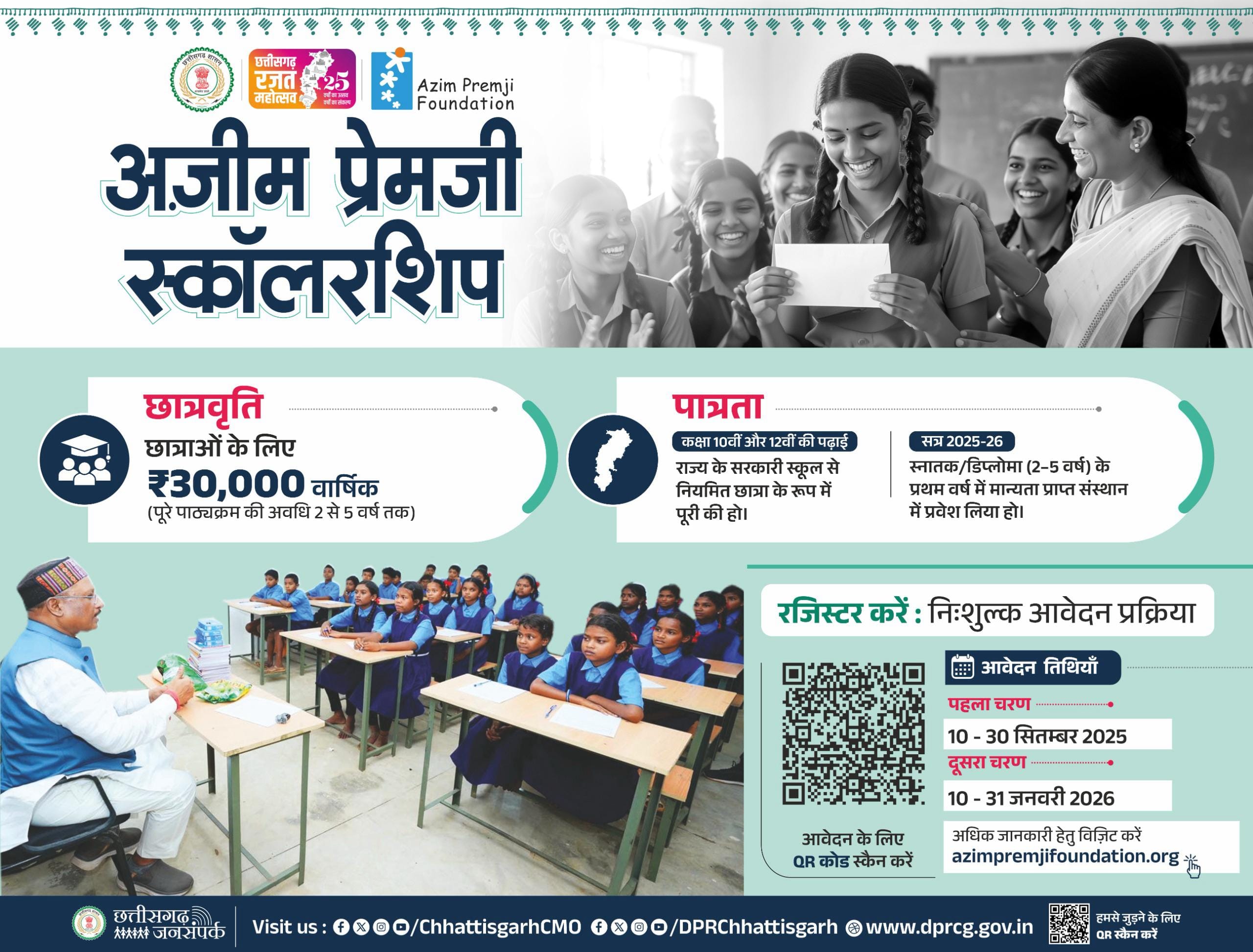 सुकमा, 10 सितम्बर। मुख्यमंत्री श्री विष्णु देव साय ने आज अजीम प्रेमजी स्कॉलरशिप योजना का शुभारंभ किया। यह योजना प्रदेश की बालिकाओं के लिए शिक्षा एवं सशक्तिकरण का नया अध्याय साबित होगी।