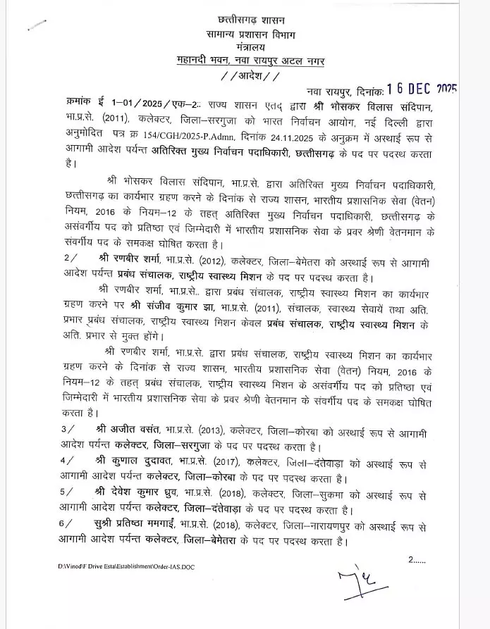 इस व्यापक फेरबदल में सिर्फ कोरबा ही नहीं, बल्कि कई अन्य जिलों और महत्वपूर्ण पदों पर भी नई जिम्मेदारियां सौंपी गई हैं—