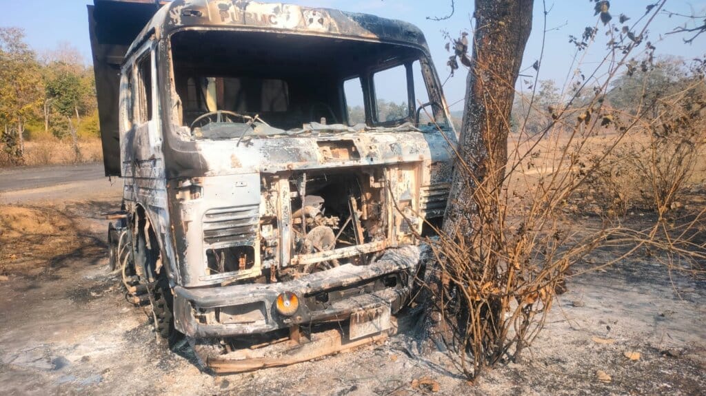 मौके का मंजर: रात के सन्नाटे में धमाकों की आवाज से पूरा जंगल गूंज उठा। टायर और डीजल टैंक फटने के कारण आग की लपटें काफी ऊंचाई तक उठ रही थीं।
