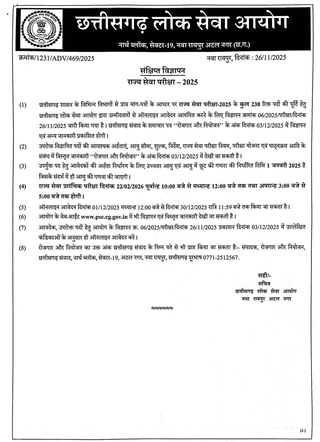 छत्तीसगढ़ लोक सेवा आयोग ने जारी किया राज्य सेवा परीक्षा–2025 का संक्षिप्त विज्ञापन, 238 पदों पर होगी भर्ती