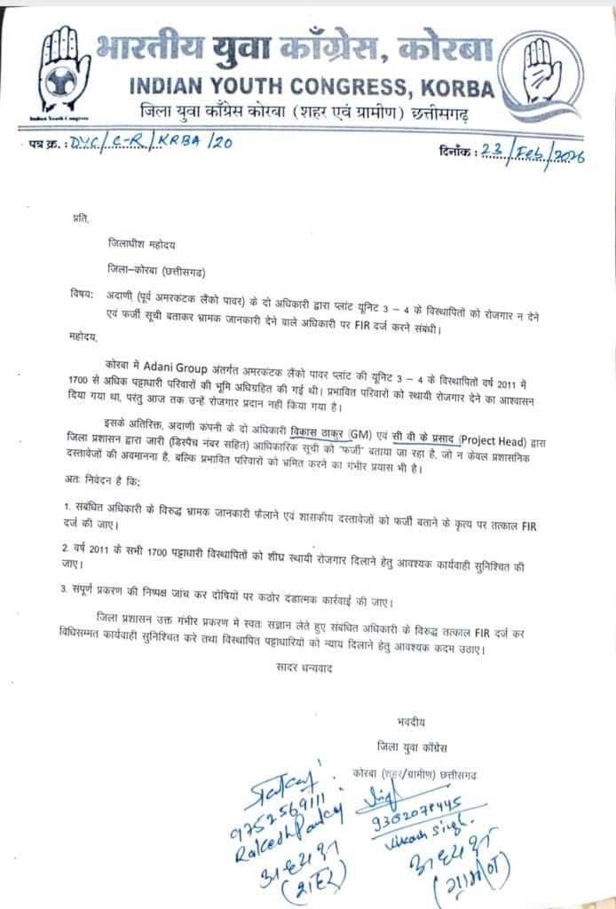 कोरबा। भारतीय युवा कांग्रेस, कोरबा (शहर एवं ग्रामीण) ने अडानी समूह के अमरकंटक लैंको पावर प्लांट की यूनिट 3–4 से जुड़े विस्थापितों के रोजगार मामले को लेकर जिला प्रशासन को ज्ञापन सौंपा है। संगठन ने कंपनी के दो वरिष्ठ अधिकारियों पर भ्रामक जानकारी देने और शासकीय दस्तावेजों को “फर्जी” बताने का आरोप लगाते हुए उनके खिलाफ तत्काल FIR दर्ज करने की मांग की है।