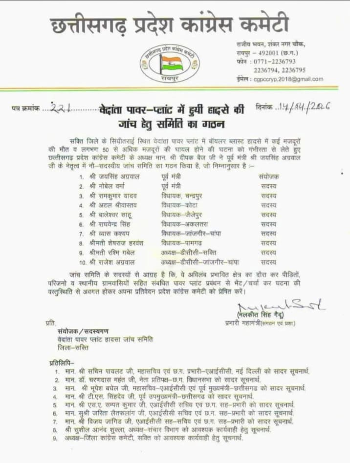 समिति के सदस्य घटनास्थल का दौरा कर पीड़ित परिवारों, घायलों एवं स्थानीय लोगों से मुलाकात करेंगे। साथ ही प्लांट प्रबंधन की लापरवाही, सुरक्षा मानकों की अनदेखी और हादसे के वास्तविक कारणों की पड़ताल कर विस्तृत रिपोर्ट प्रदेश कांग्रेस कमेटी को सौंपेंगे।