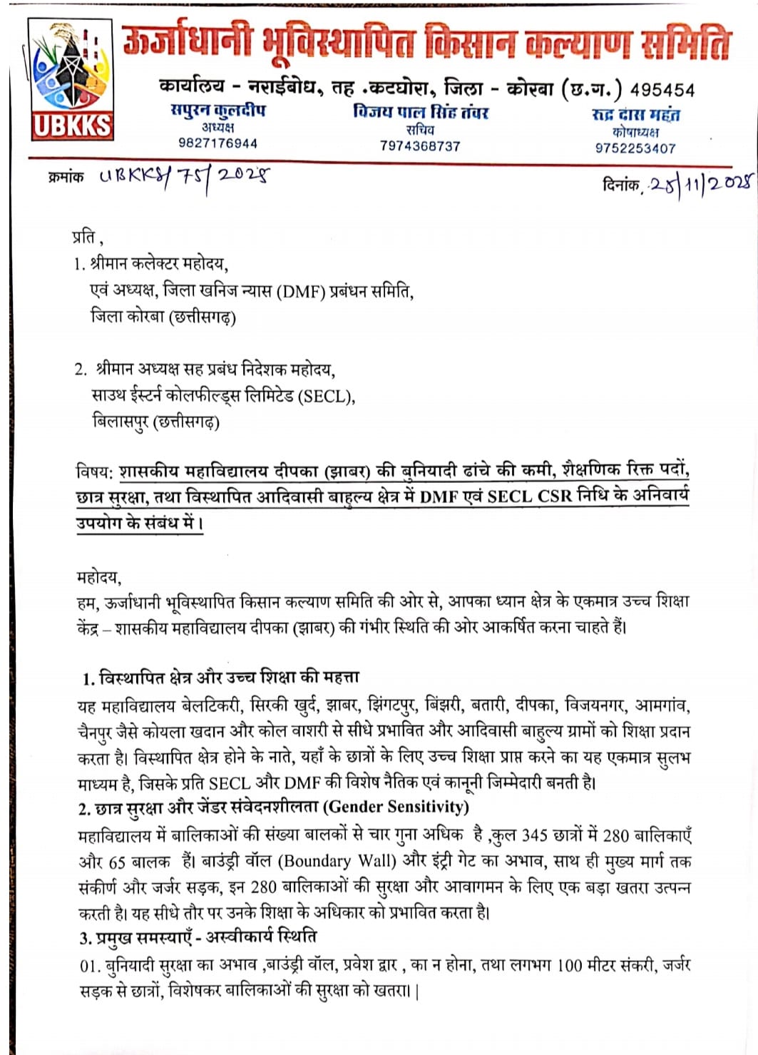 कोरबा जिले के दीपका (झाबर) स्थित शासकीय महाविद्यालय में लगातार बढ़ रही अव्यवस्थाओं और मूलभूत सुविधाओं के अभाव को लेकर ऊर्जाधानी भूविस्थापित किसान कल्याण समिति ने गंभीर चिंता जताई है। शुक्रवार को समिति ने जिला कलेक्टर-सह-अध्यक्ष, जिला खनिज न्यास (DMF) प्रबंधन समिति और एसईसीएल के CMD को ज्ञापन सौंपकर कॉलेज की बदहाल स्थिति को तत्काल सुधारने की मांग की।