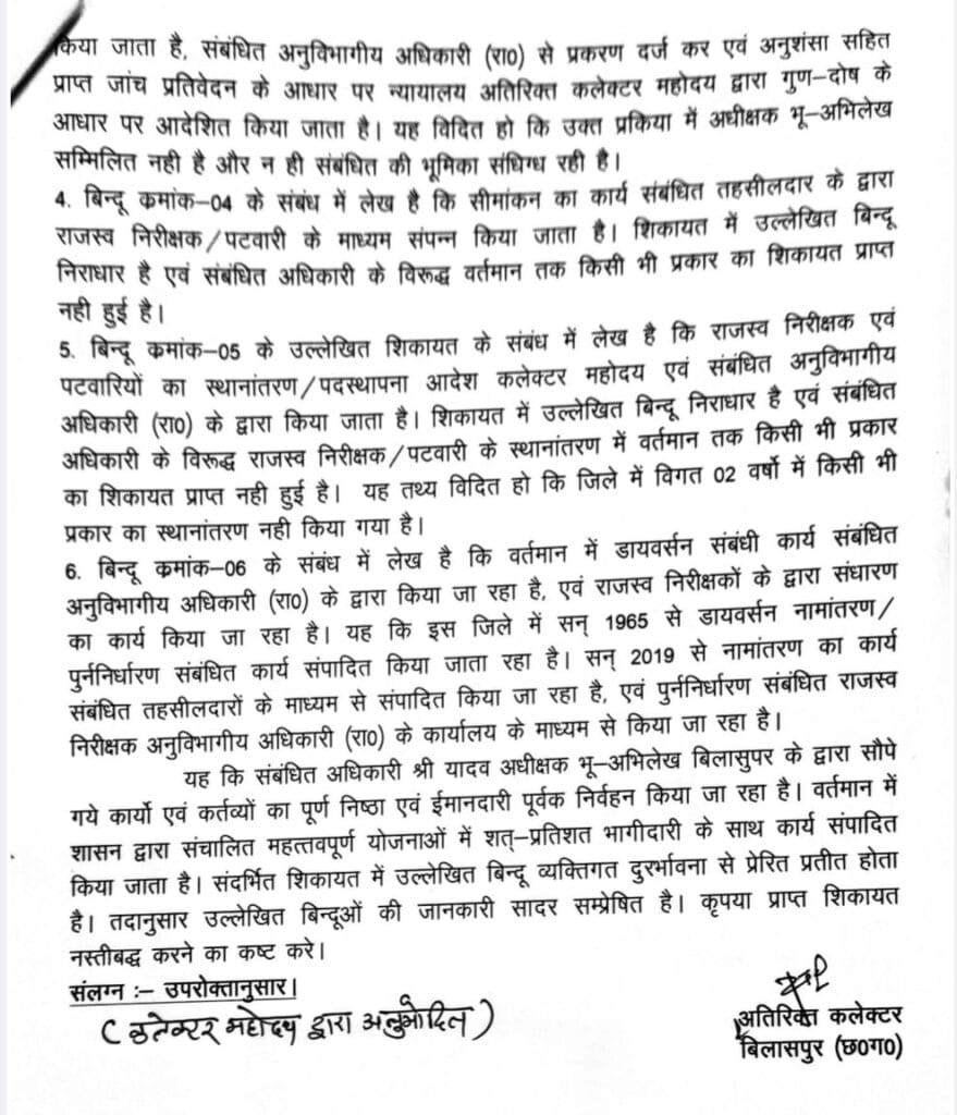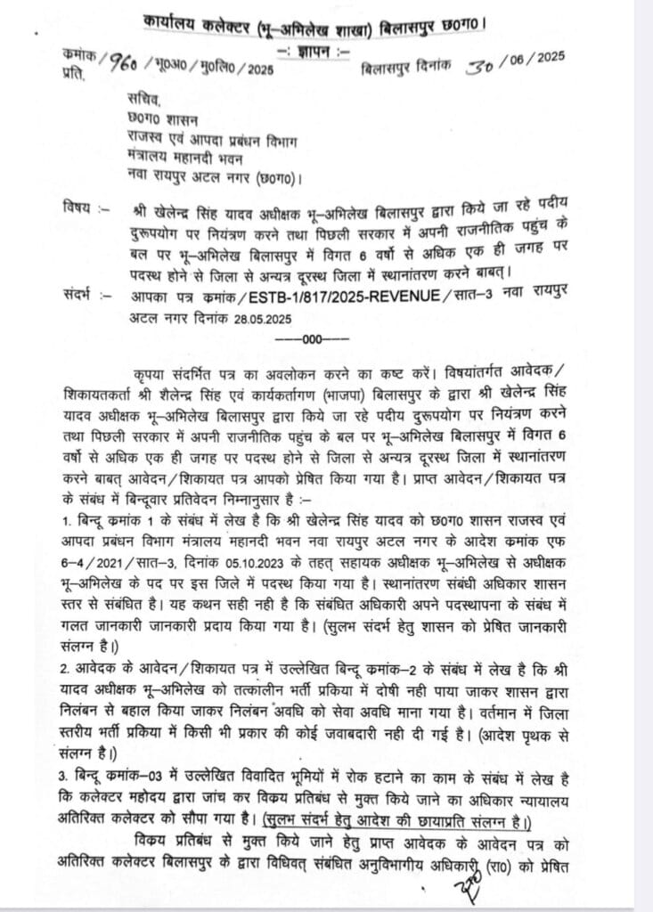 जांच रिपोर्ट 28 मई 2025 की शिकायत पर कलेक्टर द्वारा भेजी गई जांच रिपोर्ट में आरोपों को ‘निराधार और द्वेषपूर्ण’ बताया जा चुका है।