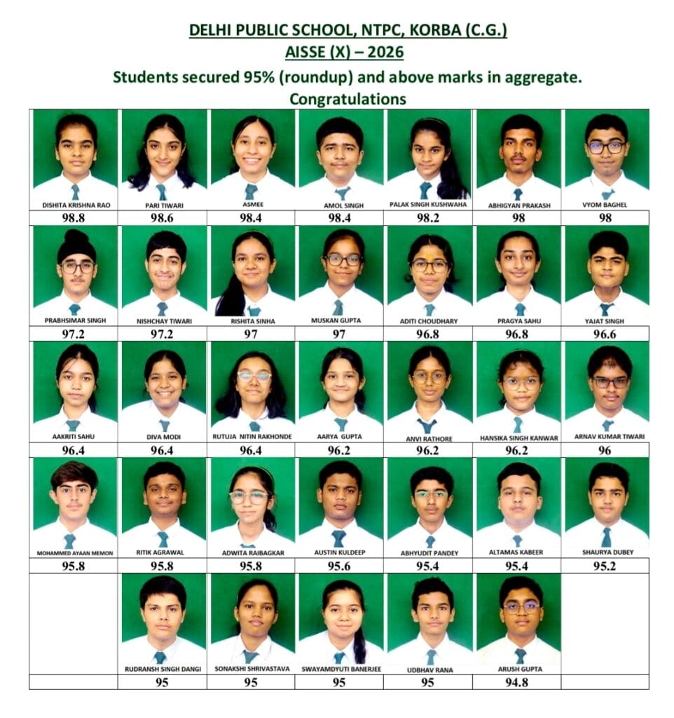 कोरबा – कोरबा के दिल्ली पब्लिक स्कूल, एनटीपीसी जमनीपाली ने कक्षा 10वीं (AISSE – 2026) में ऐसा शानदार प्रदर्शन किया है, जिसने पूरे जिले ही नहीं बल्कि प्रदेश में चर्चा बटोर ली है। स्कूल का 100% रिजल्ट रहा, जहां सभी 124 छात्र सफल हुए।