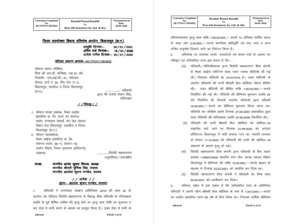 बिलासपुर। कोविड-19 से हुई मृत्यु के एक मामले में बिलासपुर जिला उपभोक्ता विवाद प्रतितोष आयोग ने बीमा कंपनियों के लिए नजीर बनने वाला फैसला सुनाया है। आयोग ने मैक्स लाइफ इंश्योरेंस को मृतका के परिजनों को 1 करोड़ रुपये की बीमा राशि 12 प्रतिशत वार्षिक ब्याज सहित देने का निर्देश दिया है। साथ ही मानसिक प्रताड़ना और वाद व्यय के रूप में 2 लाख रुपये अतिरिक्त भुगतान का आदेश भी दिया गया है।