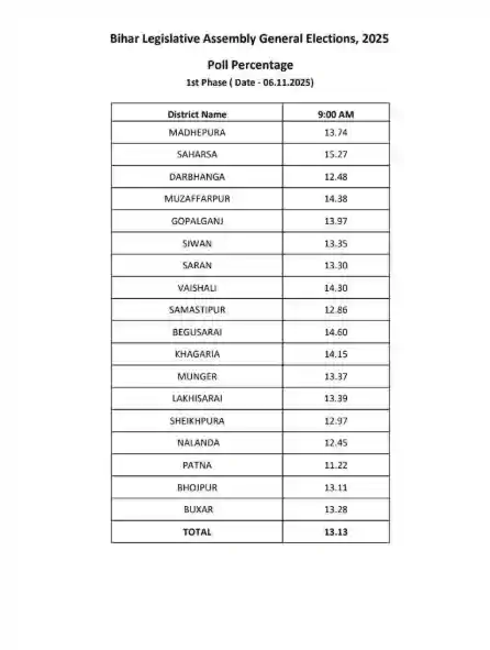बिहार में आज लोकतंत्र के महापर्व का आगाज़ पूरे उत्साह के साथ हुआ। पहले चरण में 18 जिलों की 121 विधानसभा सीटों पर मतदान जारी है। सुबह 9 बजे तक राज्य में 13.13% से अधिक मतदान दर्ज किया गया है। वहीं गोपालगंज में 36% और छपरा में 12% वोटिंग हुई है। मतदान शांतिपूर्ण माहौल में चल रहा है और मतदाता लंबी कतारों में अपने मताधिकार का प्रयोग कर रहे हैं।