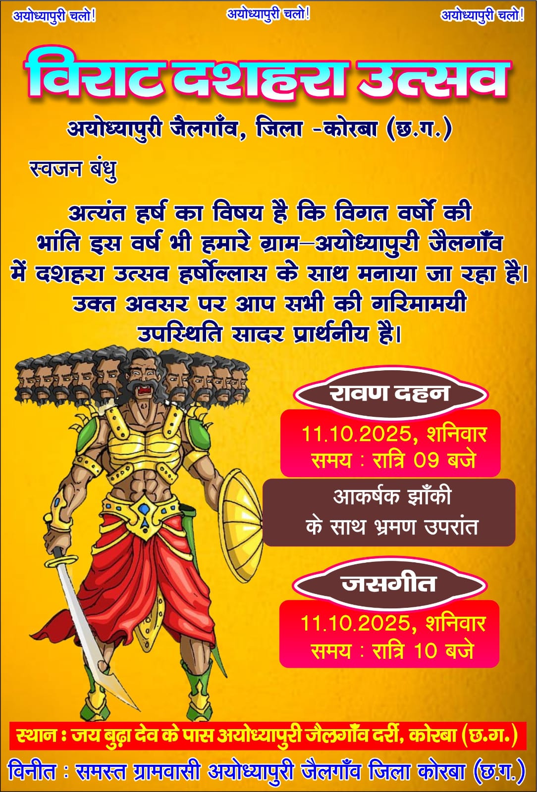 कोरबा जिले के अयोध्यापुरी जेलगांव में इस वर्ष भी दशहरा उत्सव हर्षोल्लास और धूमधाम के साथ मनाया जा रहा है। ग्रामवासियों ने इस भव्य आयोजन की तैयारियाँ पूरी कर ली हैं और सभी आगंतुकों का स्वागत सादर किया गया है।
