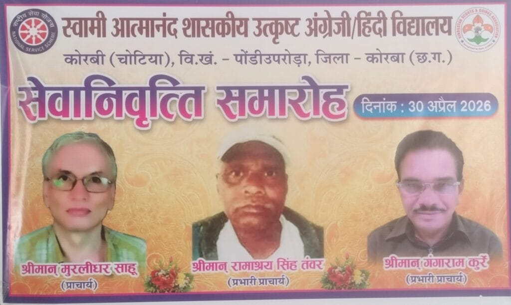 पोड़ी उपरोड़ा विकासखंड के स्वामी आत्मानंद शासकीय उत्कृष्ट विद्यालय कोरबी (चोटिया) एवं स्वामी आत्मानंद अंग्रेजी माध्यम स्कूल में गुरुवार को एक गरिमामय और भावुक सेवानिवृत्ति समारोह आयोजित किया गया। इस अवसर पर वरिष्ठ प्राचार्य मुरलीधर साहू, प्रभारी प्राचार्य रामाश्रय तंवर और पाली (दुल्लापुर) हाई स्कूल के प्रभारी प्राचार्य गंगाराम कुर्रे को सम्मानपूर्वक विदाई दी गई।