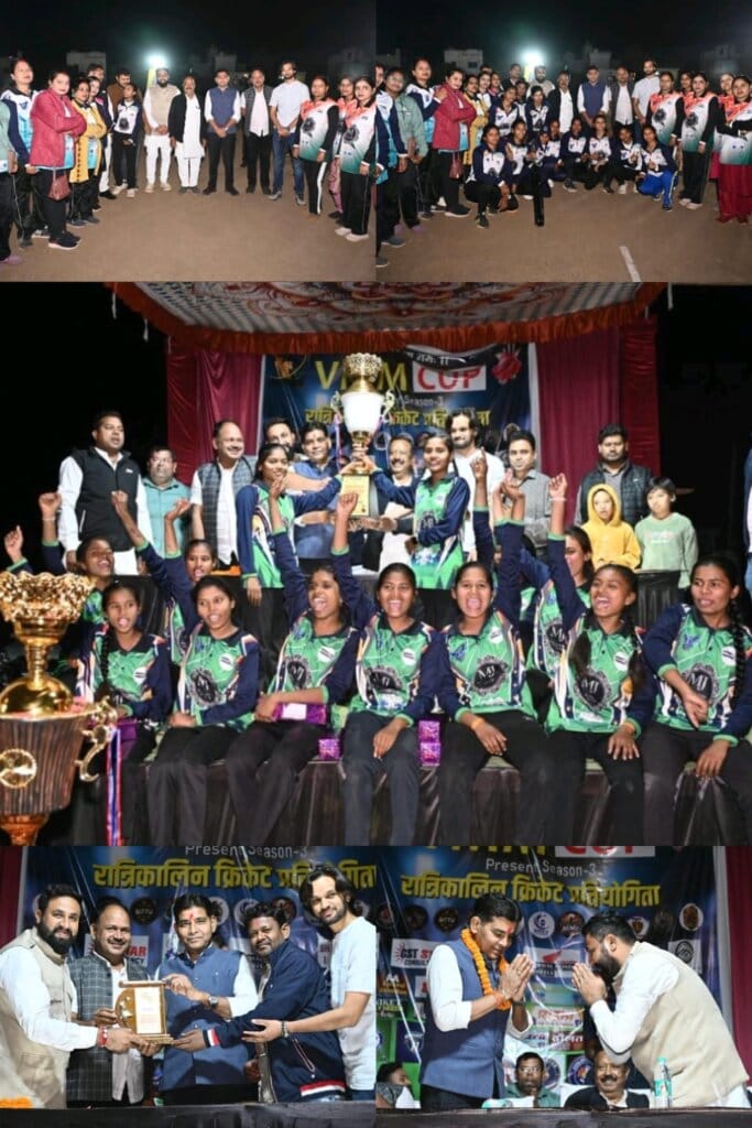 तिल्दा-नेवरा। विकास मित्र मंडल द्वारा आयोजित रात्री कालीन महिला एवं पुरुष क्रिकेट स्पर्धा शानदार समापन के साथ संपन्न हुई। लगभग 15 दिनों तक चले इस भव्य आयोजन में कुल ₹2 लाख की नगद इनामी राशि रखी गई थी। प्रतियोगिता में 10 महिला टीमों और 12 पुरुष टीमों ने उत्साहपूर्वक भाग लिया।