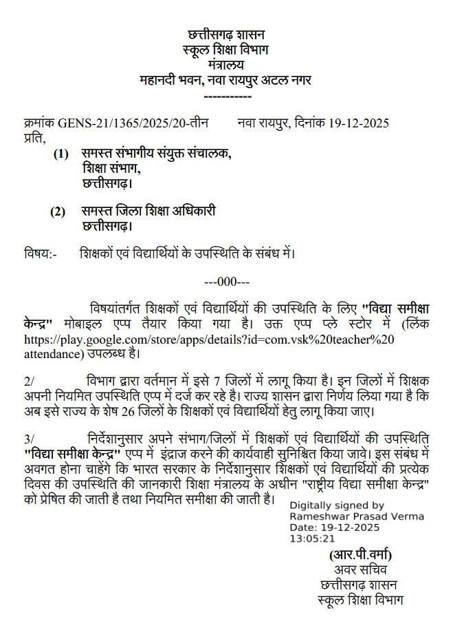 छत्तीसगढ़ में शिक्षकों व विद्यार्थियों की उपस्थिति अब ‘विद्या समीक्षा केंद्र’ ऐप से होगी दर्ज