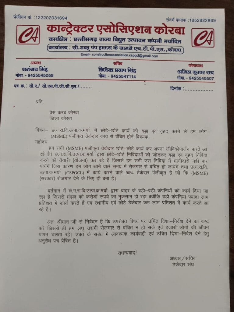 एचटीपीपी, कोरबा पूर्व, डॉ. श्यामा प्रसाद मुखर्जी (डीएसपीएम) और अटल बिहारी वाजपेयी ताप विद्युत संयंत्र, मड़वा में कार्यरत ठेकेदारों ने संयुक्त रूप से आयोजित पत्रकार वार्ता में अपनी पीड़ा जाहिर की। कांट्रेक्टर एसोसिएशन के अध्यक्ष धनंजय सिंह समेत अन्य पदाधिकारियों ने बताया कि कंपनी अब 5 से 10 करोड़ रुपए तक की बड़ी-बड़ी निविदाएं जारी कर रही है, जिससे स्थानीय ठेकेदार पूरी तरह प्रतिस्पर्धा से बाहर होते जा रहे हैं।