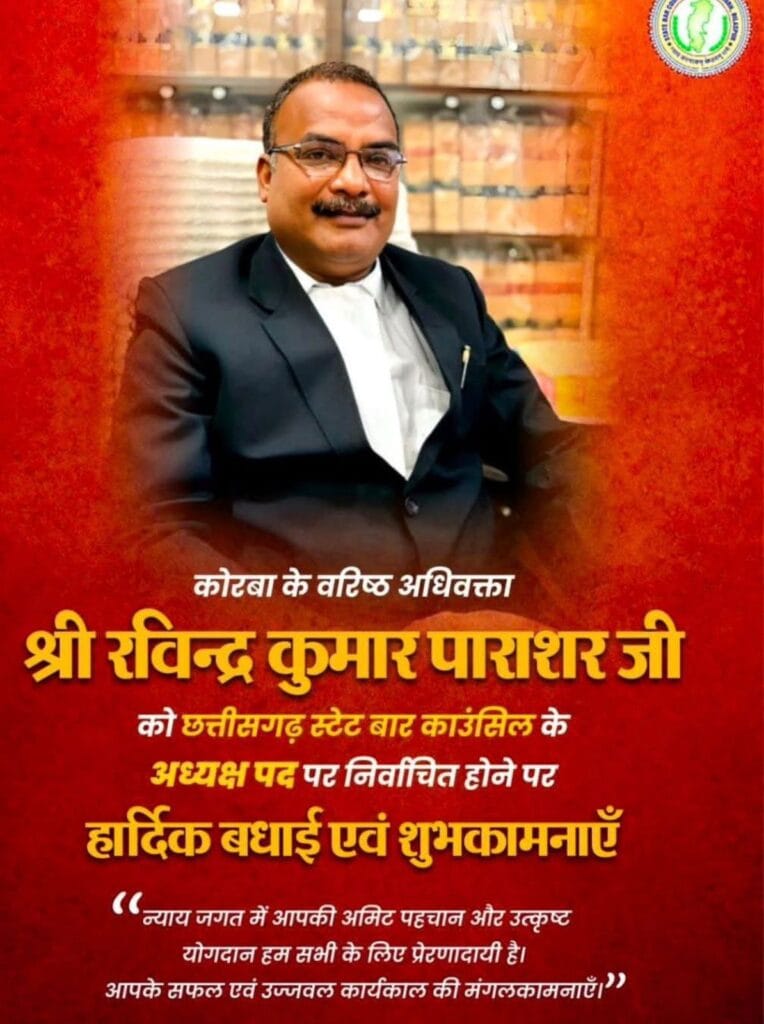 कोरबा। जिले के लिए गर्व का विषय है कि वरिष्ठ अधिवक्ता श्री रविन्द्र कुमार पाराशर को छत्तीसगढ़ स्टेट बार काउंसिल का अध्यक्ष निर्वाचित किया गया है। उनके इस महत्वपूर्ण चयन से कोरबा सहित पूरे प्रदेश के अधिवक्ता समुदाय में हर्ष और उत्साह का माहौल है।