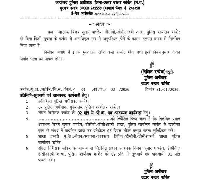 पुलिस अधीक्षक उत्तर बस्तर कांकेर द्वारा जारी आदेश में उल्लेख है कि प्रधान आरक्षक विजय कुमार पांडेय को कर्तव्य से अनाधिकृत रूप से अनुपस्थित रहने के कारण तत्काल प्रभाव से निलंबित किया जाता है। निलंबन अवधि के दौरान उनका मुख्यालय रक्षित केंद्र, कांकेर रहेगा तथा वे नियमानुसार जीवन निर्वाह भत्ता पाने के पात्र होंगे।