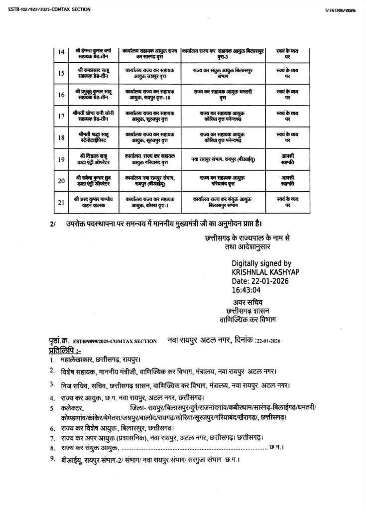 जारी सूची के अनुसार धमतरी, दुर्ग, कोंडागांव, कांकेर, गरियाबंद, रायपुर, बालोद, दंतेवाड़ा, कवर्धा, राजनांदगांव, खैरागढ़, सारंगढ़, रायगढ़, बेमेतरा, जशपुर, सूरजपुर, कोरिया, कोरबा और बिलासपुर सहित अन्य जिलों में कर्मचारियों की नई पदस्थापना की गई है।