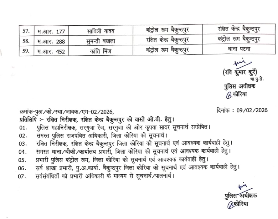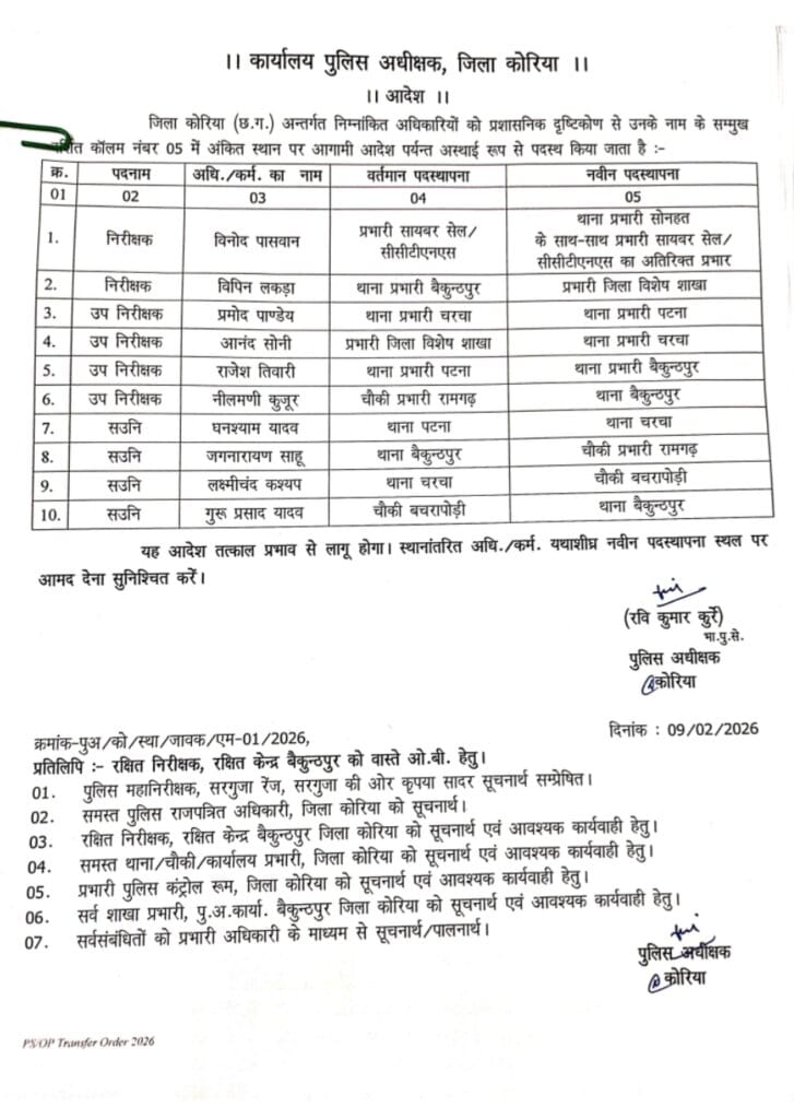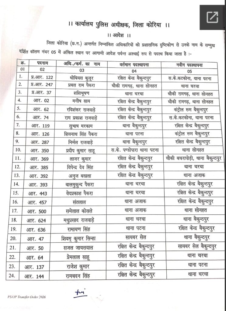 कोरिया। छत्तीसगढ़ के कोरिया जिले में पुलिस महकमे में व्यापक स्तर पर प्रशासनिक फेरबदल किया गया है। पुलिस अधीक्षक रवि कुमार कुर्रे ने जिले के 69 पुलिस अधिकारियों और कर्मचारियों की तबादला सूची जारी की है। जारी आदेश में विभिन्न थानों, चौकियों, रक्षित केंद्र, कंट्रोल रूम, साइबर सेल और अन्य शाखाओं में पदस्थ अधिकारियों के नाम शामिल हैं।
