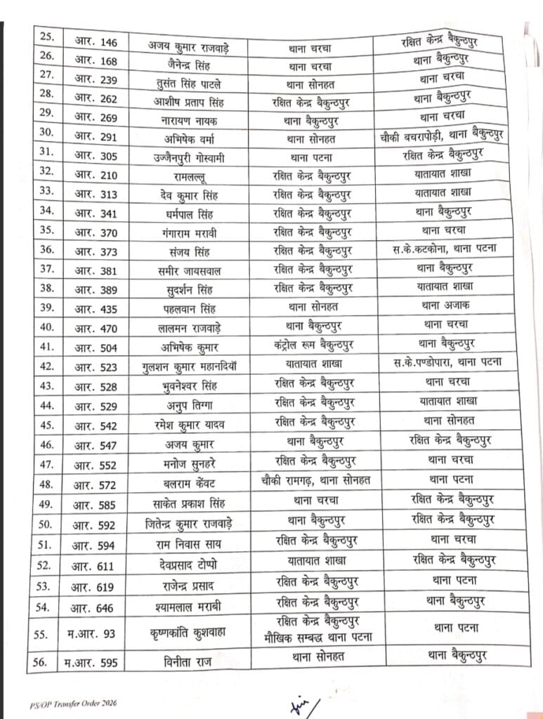 सूची में निरीक्षक, उप निरीक्षक, सहायक उप निरीक्षक, प्रधान आरक्षक और आरक्षक स्तर के कर्मचारी शामिल हैं। थाना बैकुंठपुर, चरचा, पटना, सोनहत सहित विभिन्न चौकियों में पदस्थापना में बदलाव किया गया है। कुछ अधिकारियों को विशेष शाखा, साइबर सेल और कंट्रोल रूम जैसी महत्वपूर्ण इकाइयों में नई जिम्मेदारी सौंपी गई है।