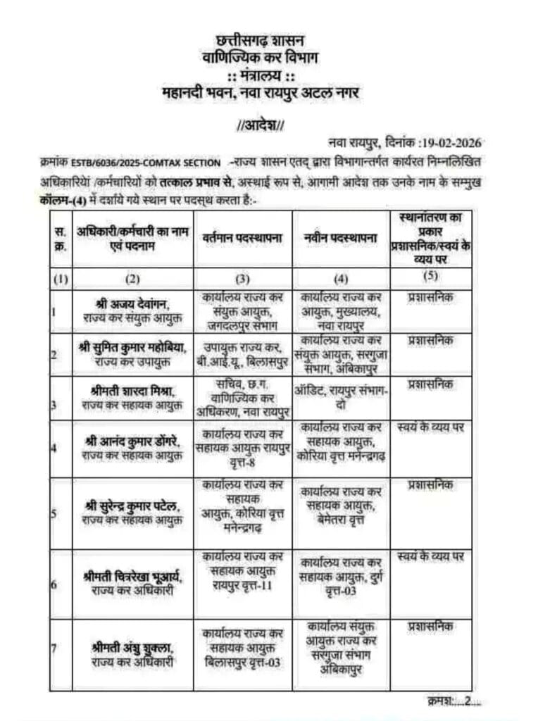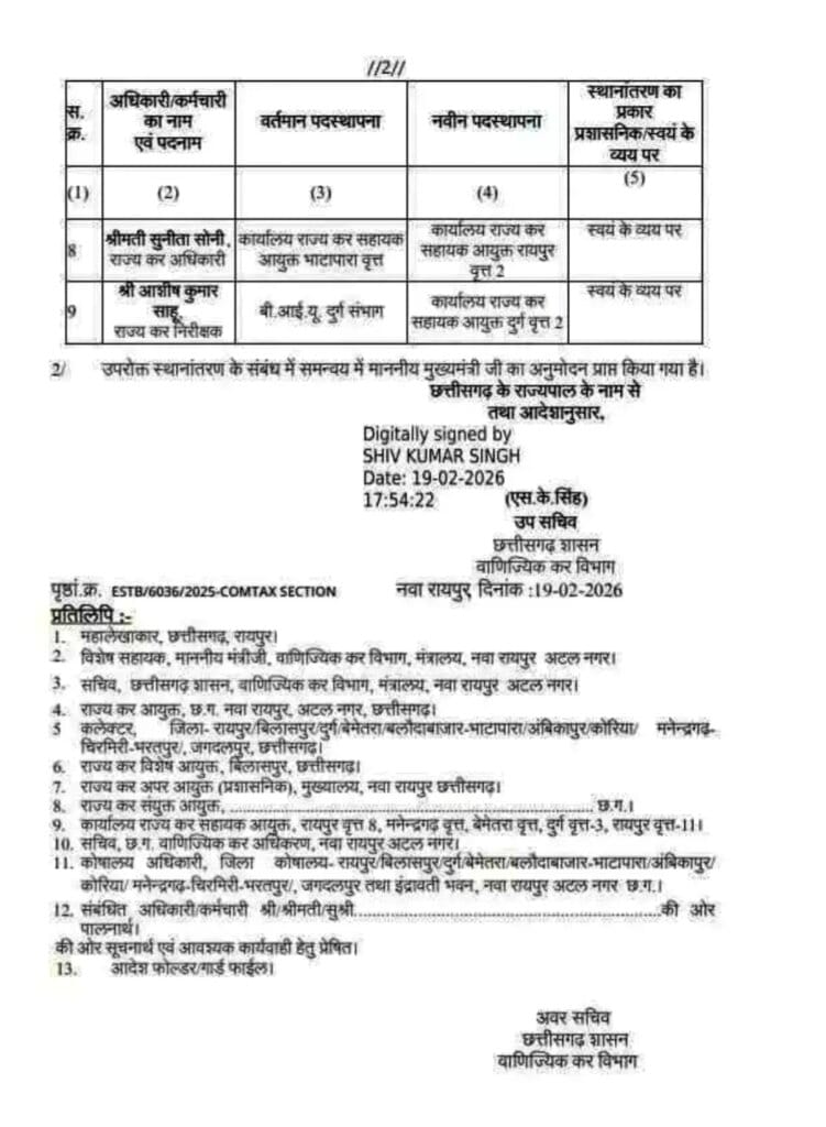 रायपुर। छत्तीसगढ़ शासन के वाणिज्यिक कर विभाग ने प्रशासनिक कसावट लाने के उद्देश्य से अधिकारियों की नवीन पदस्थापना सूची जारी की है। इस फेरबदल में संयुक्त आयुक्त से लेकर राज्य कर निरीक्षक स्तर के 9 अधिकारियों को नई जिम्मेदारियां सौंपी गई हैं।