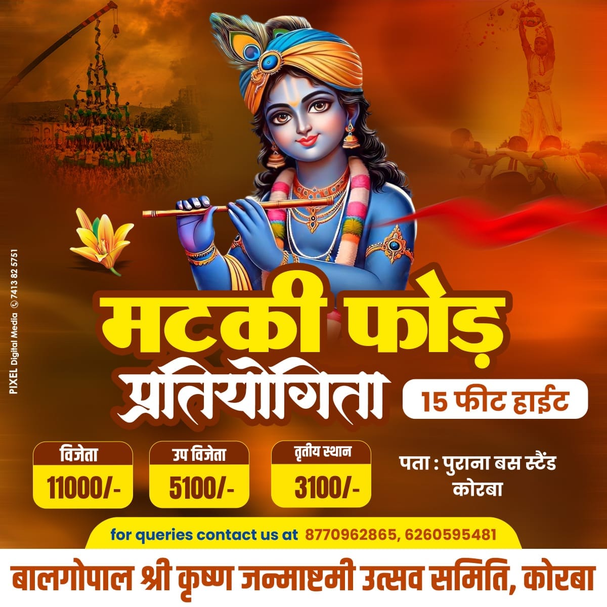 कोरबा।बालगोपाल श्री कृष्ण जन्माष्टमी उत्सव समिति कोरबा द्वारा आगामी 16 अगस्त को पुराना बस स्टैंड कोरबा में पहली बार भव्य मटका फोड़ प्रतियोगिता का आयोजन किया जाएगा। शाम 6 बजे से शुरू होने वाले इस कार्यक्रम में 15 फीट ऊँचाई पर लटकी मटकी को फोड़ने के लिए टीमें अपनी ताकत और रणनीति दिखाएंगी।