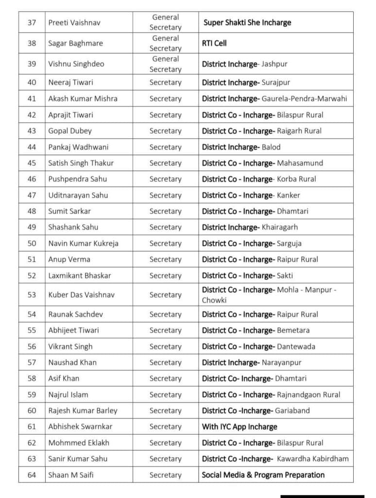 छत्तीसगढ़ प्रदेश युवा कांग्रेस ने संगठन को और अधिक सशक्त व सक्रिय बनाने की दिशा में बड़ा कदम उठाते हुए प्रदेश स्तरीय पदाधिकारियों को विभिन्न जिलों की महत्वपूर्ण जिम्मेदारियाँ सौंपी हैं। इस संबंध में प्रदेश युवा कांग्रेस द्वारा कार्य आवंटन आदेश जारी किया गया है।