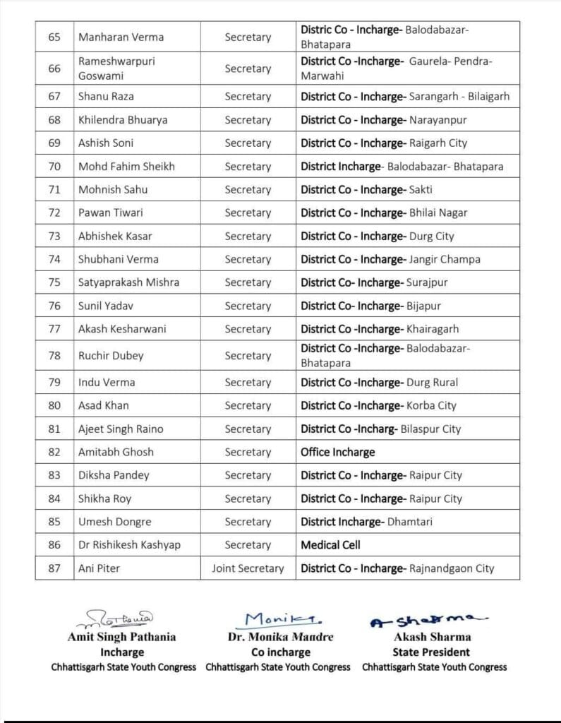 राजीव भवन, शंकर नगर स्थित प्रदेश कार्यालय से जारी आदेश के अनुसार, युवा कांग्रेस के उपाध्यक्ष एवं महासचिवों को अलग-अलग जिलों का जिला प्रभारी नियुक्त किया गया है, ताकि संगठनात्मक गतिविधियों को ज़मीनी स्तर पर मज़बूती मिल सके और युवाओं की भागीदारी को और बढ़ाया जा सके।