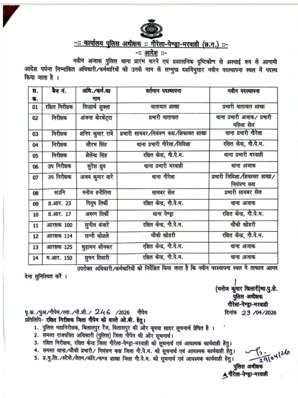 कोरबा कोरबा पुलिस की अपील: नववर्ष का जश्न कानून के दायरे में मनाएं, नियम तोड़ने पर होगी सख्त कार्रवाई Manoj ThakurDecember 28, 2025 ✍️ भागीरथी यादव कोरबा। नववर्ष 2026 के आगमन को लेकर कोरबा पुलिस ने जिलेवासियों से शांति, सुरक्षा और अनुशासन…