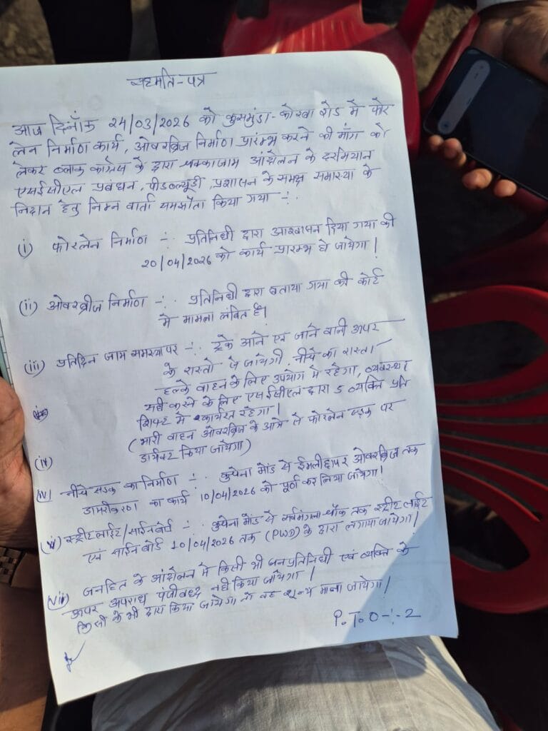 धरना के बाद प्रशासन, एसईसीएल और पीडब्ल्यूडी के साथ हुई वार्ता में कई महत्वपूर्ण बिंदुओं पर सहमति बनी—