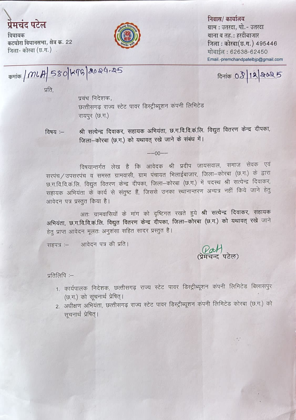 विधायक ने अपने पत्र की प्रतिलिपि बिलासपुर और कोरबा के वरिष्ठ अधिकारियों को भेजकर मामले की गंभीरता बढ़ा दी है।