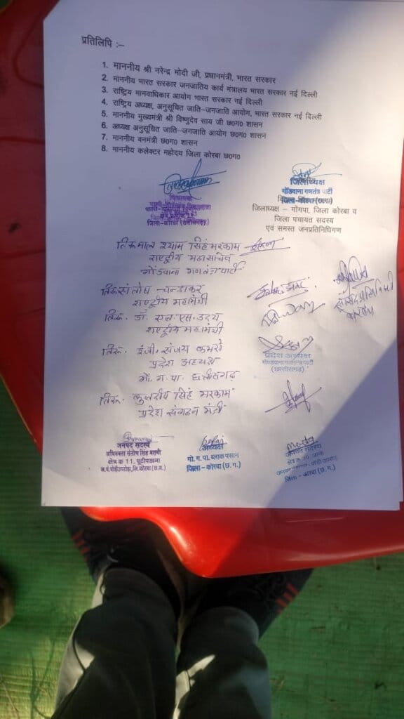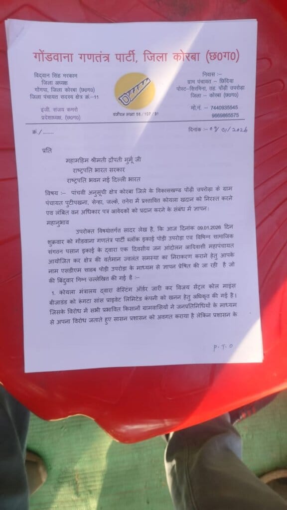 इस दौरान महामहिम राष्ट्रपति श्रीमती द्रौपदी मुर्मू के नाम अनुविभागीय अधिकारी (राजस्व) पोंड़ी उपरोड़ा के माध्यम से ज्ञापन सौंपते हुए ग्राम पंचायत पुटीपखना, सेन्हा, जल्के एवं तनेरा में प्रस्तावित कोयला खदान को तत्काल निरस्त करने की मांग की गई।