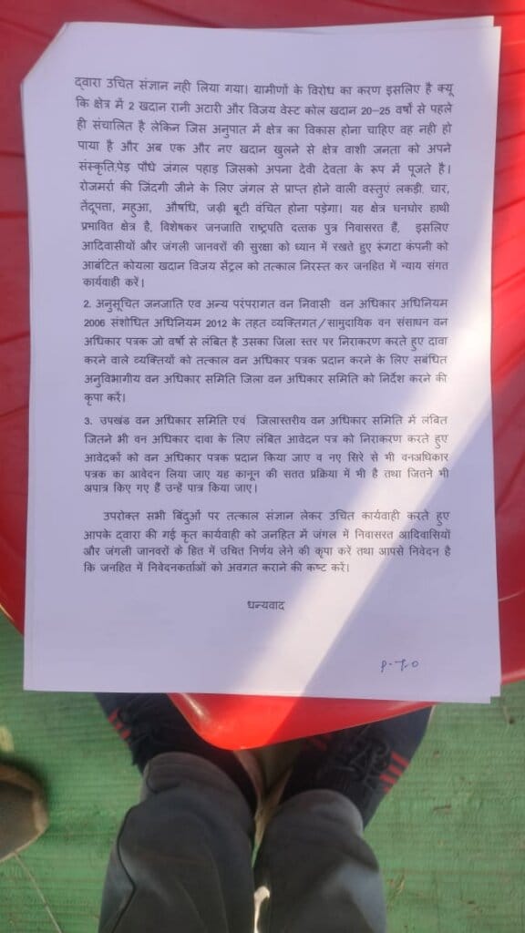 ज्ञापन में उल्लेख किया गया कि कोयला मंत्रालय द्वारा जारी वैस्टिंग ऑर्डर के तहत विजय सेंट्रल कोल माइंस बीजाडांड को रूंगटा सन्स प्राइवेट लिमिटेड को खनन हेतु आबंटित किया गया है। ग्रामीणों का कहना है कि क्षेत्र में पहले से संचालित रानी अटारी एवं विजय वेस्ट कोल माइंस से बीते 20–25 वर्षों में अपेक्षित विकास नहीं हो पाया, जबकि पर्यावरण, जंगल और आदिवासी जीवनशैली को भारी नुकसान पहुंचा है।