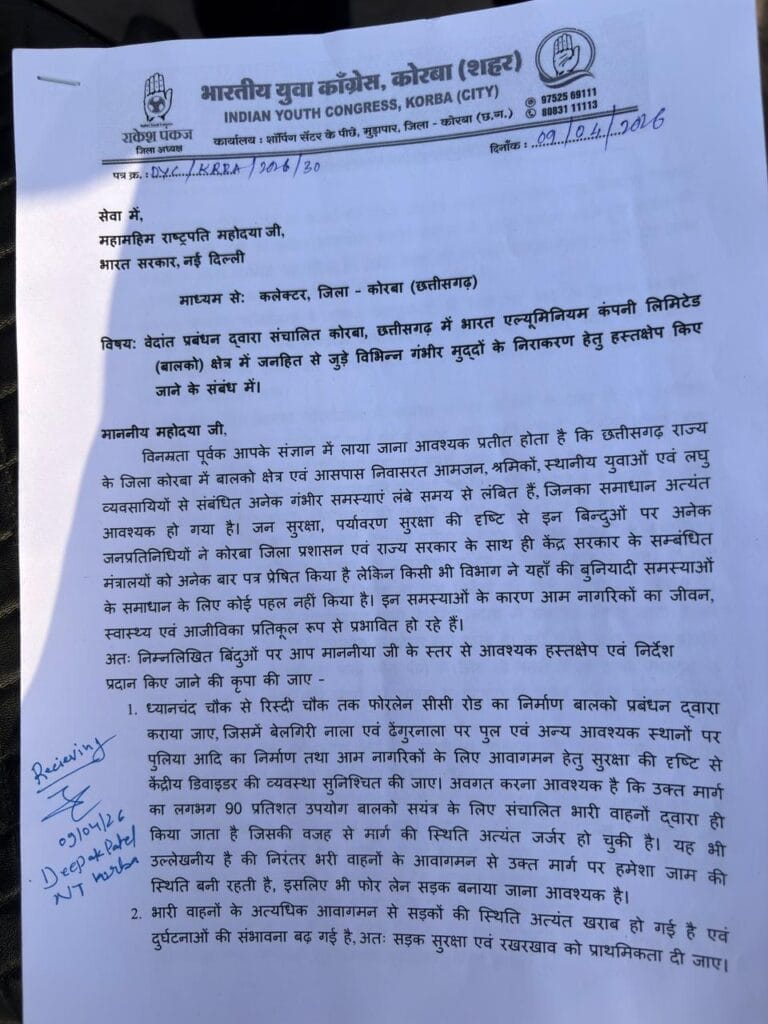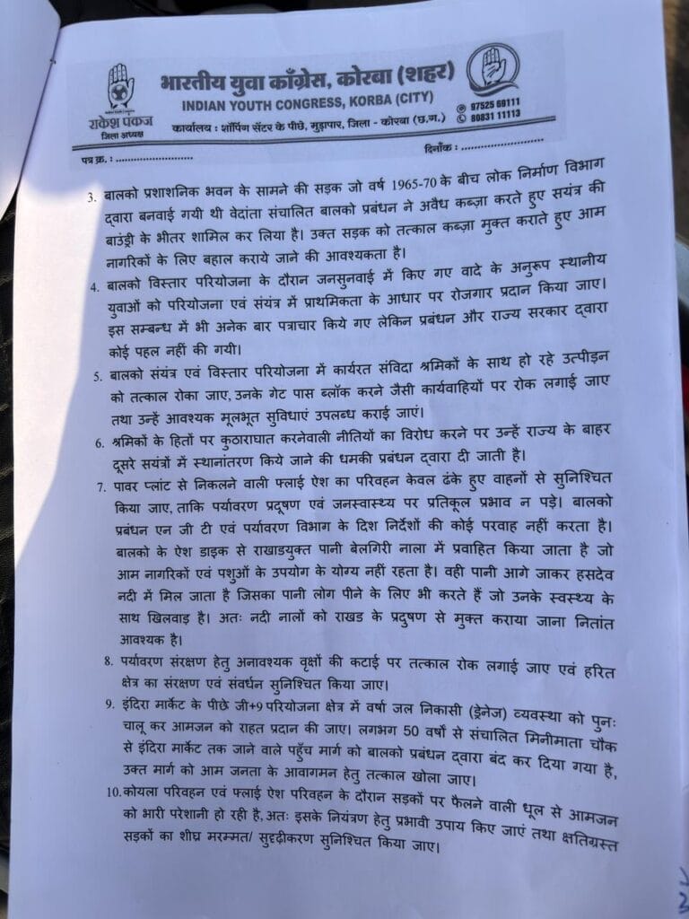 जिला कांग्रेस अध्यक्ष मुकेश राठौर ने राष्ट्रपति से हस्तक्षेप की मांग करते हुए कहा कि क्षेत्र की समस्याओं का जल्द समाधान जरूरी है। इस प्रदर्शन के बाद बालको क्षेत्र में राजनीतिक और प्रशासनिक हलचल तेज हो गई है, अब सभी की नजर प्रबंधन और प्रशासन की आगामी कार्रवाई पर टिकी है।