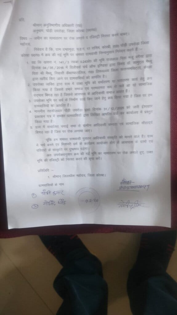 ग्रामीणों के अनुसार खसरा नंबर 141/3 रकबा 0.24360 हेक्टेयर भूमि, जिसे वर्ष 2016 में खरीदा गया था, को लेकर गांव में लगातार आपत्ति जताई जा रही है। आरोप है कि उक्त भूमि का उपयोग धार्मिक निर्माण कार्य के लिए किए जाने की तैयारी है, जिससे गांव की सामाजिक एवं सांस्कृतिक समरसता प्रभावित हो सकती है। ग्रामीणों का कहना है कि इस कदम से क्षेत्र की पारंपरिक आदिवासी संस्कृति और सामाजिक संतुलन पर विपरीत असर पड़ेगा।